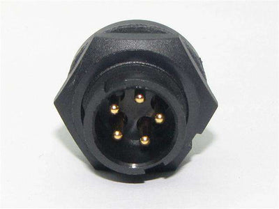 Mini-Con-X 5-position Panel Mount Pin Connector with Contact Size #16 Gold plated PC Tail style Pins and Standard Panel Mount Backshell with epoxy