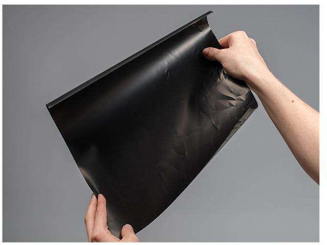 This conductive material (also known as "Velostat" or "Linqstat") is a nice addition for your wearable/sensor hacking toolkit. It's pressure-sensitive: squeezing it will reduce the resistance, so it's handy for making flexible sensors. And it's a lot less expensive than off-the-shelf pressure or bend sensors too! Each order comes with a 11"x11" (28cm x 28cm) 4mil (0.1mm) thick piece. To remove any hard creases, simply lay flat on a table and put a heavy book on top to flatten it out.