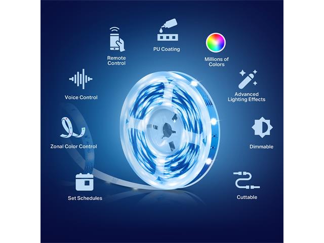 TP-LINK Tapo Smart WiFi LED Strip Light Individual Multicolour 5M, WiFi Frequency:2.4GHz IEEE 802.11b/g/n, RGB LED, Normal Life Time:25000 HRS, Voltage:220-240VAC 50/60 Hz 20.5W, No HUB Required, TEMP:-15ºC~ 40ºC, Dimmable:1%~100%(VIA APP&CLOUD)57g
