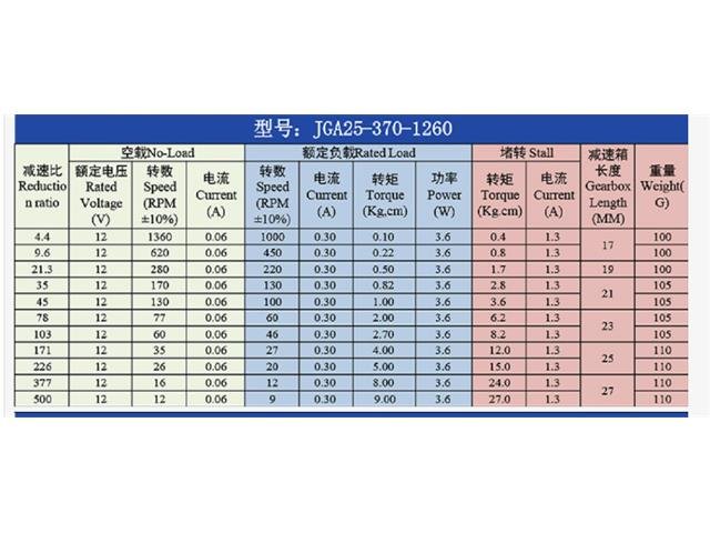 | 12 | JGA25-370 | 1931 | 12 V | 1200 mA | 0.44 kg·cm | 1:4.4 Gearmotor |