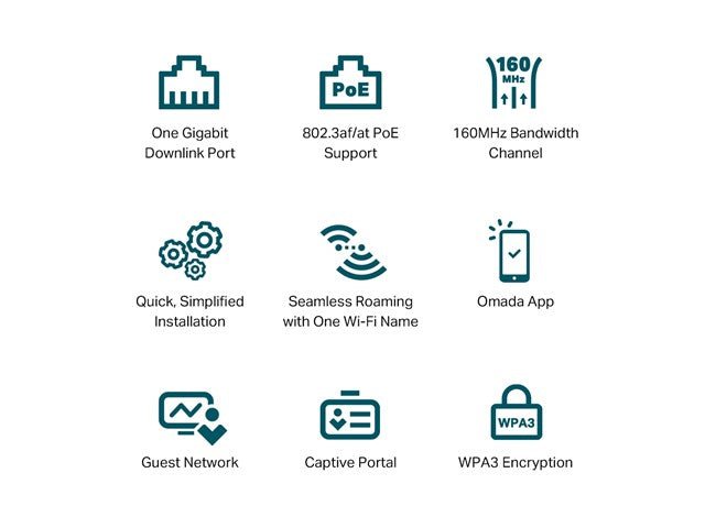 | Wireless Security | • Captive Portal Authentication§ • Access Control • Wireless Mac Address Filtering • Wireless Isolation Between Clients • VLAN • Rogue AP Detection • 802.1X Support • WPA-Personal/Enterprise, WPA2-Personal/Enterprise, WPA3-Personal/Enterprise |