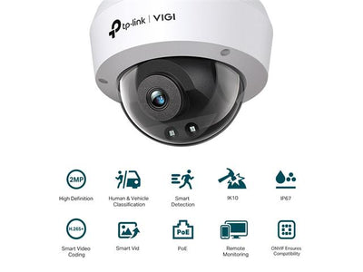 TP-LINK VIGI Dome Network Camera 2MP 2.8mm Lens, 1/3” CMOS, 30m IR, MAX RES:1920x1080, DWDR, H2.65+, BLC/3D DNR/HLC/SMART IR, 3D DNR, 1xRJ45 10/100M, ONVIF, PoE (802.3af/at), IP67