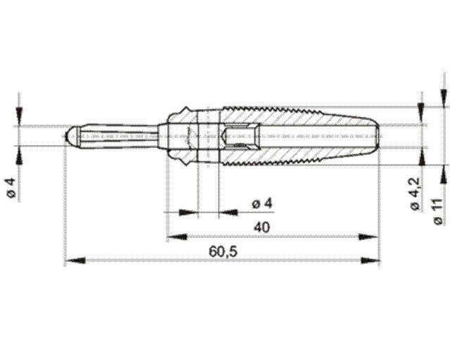 Multiple-spring wire plug, shatter-proof, flexible insulated sleeve with transverse hole. The tapering sleeve end also serves as kinking protection for the lead. Solder connection up to maximum cable cross-section of 2.5 mm². Nickel-plated brass contact material.