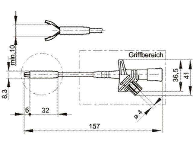 Safety clamp-type test probe with wide opening grip claws for contacting large measuring areas and leads with large cross-sections. 4 mm brass socket connection. Connects with safety measuring leads.