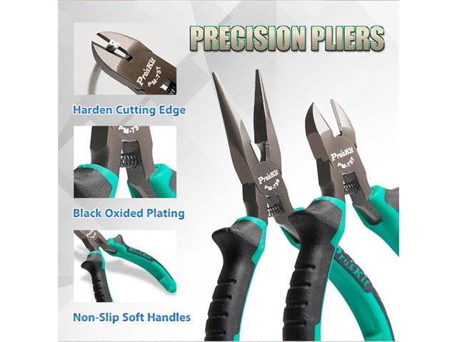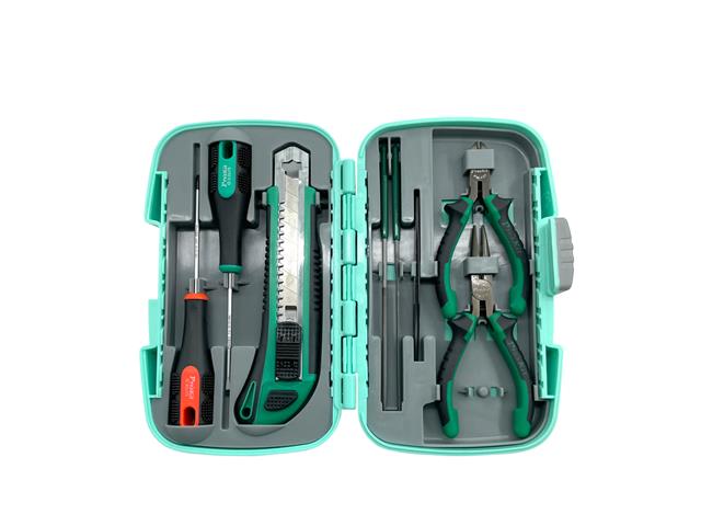 The Pro'sKit PK-301 is a compact 10-piece household tool kit designed for basic repair tasks. It comes in a dual-color TPR+PP case, measuring 205 x 144 x 32 mm and weighing 0.6 kg.