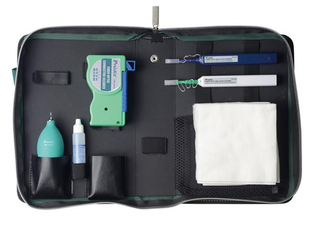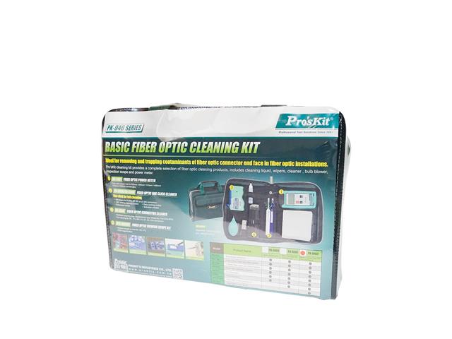Ideal for removing and trapping contaminants of fiber optic connector end face in fiber optic installations. Pro’sKit cleaning kit provides a complete selection of fiber optic cleaning products, includes cleaning liquid, wipers, cleaner , bulb blower, inspection scope and power meter