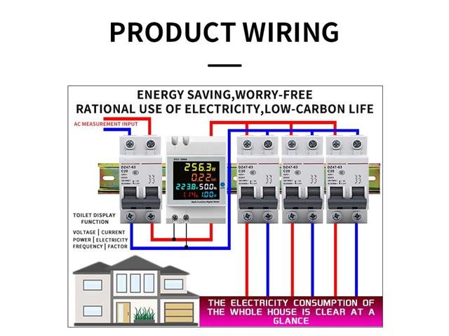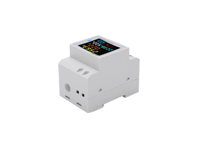 The guide rail type digital display multi-function meter simultaneously displays 6 parameters such as AC voltage, AC current, active power, power factor, frequency and electric energy on the instrument. The meter uses a color full-view high-definition LCD display to display the measurement results.