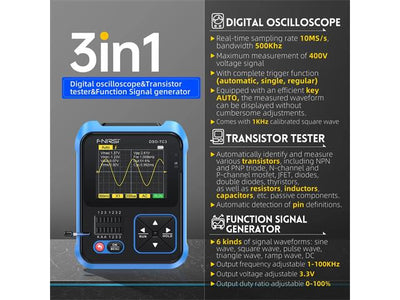 3-IN-1 Integration: digital storage oscilloscope, component tester, signal generator for beginners, hobbyist.