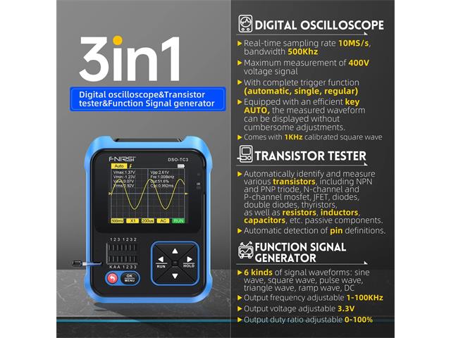 DSO-TC3 is a 3-IN-1 Handheld Digital Oscilloscope+ Signal GEN+ Transistor Tester. It has a Single Channel Oscilloscope with a 500KHz Bandwidth and 10MSA/S Sampling Rate. (Does Not Include FNIRSI P6100 X1 X10 SCOPE PROBE and BDD OSCOPE PROBE BNC-MCX ADAPT)