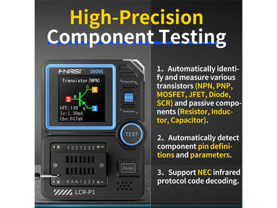 The LCR-P1 Transistor Tester is a high-precision, multifunctional electronic testing device designed specifically for electronic engineers, technicians, and enthusiasts.This device is intended for detecting and analyzing the performance and characteristics of semiconductor components such as transistors, diodes, triodes, and field-effect transistors (FETs).Equipped with a color screen, it allows for multi-parameter measurement of various components, automatically identifies the type and pin arrangement of the tested component, simplifying the operation process and enhancing testing efficiency.