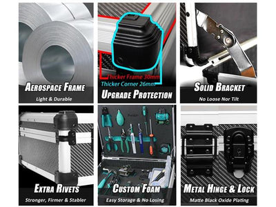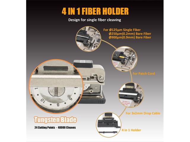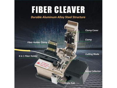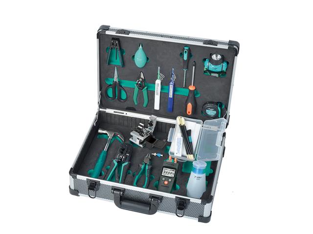 Includes 4 in 1 fiber optic power mulitmeter, 1.25mm/2.5mm cleaning tool, fiber stripper, drop cable stripper, kevlar scissors, optical Fiber Cleaver, 6P/8P crimper, LED head light.