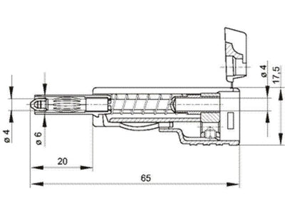 Banana plug, touch-protected, with capability of further connection, with solder connection for cross-sections up to 2.5 mm², insulated by latching and sprung insulated sleeve which is only released by pressure on the side-mounted locking spring. 4 mm dia