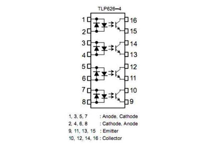 The Toshiba TLP626, −2 and −4 consist of gallium arsenide infrared emitting diodes connected in inverse parallel, optically coupled to a photo−transistor.