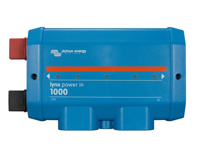 The Victron Power In contains a negative and positive DC bus-bar with M8 bolts in which to connect batteries cables. It can take cables up to 22 mm in diameter through the bottom entry guides, and no limit via the two side connections.