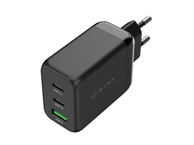 WINX Power Fast 65W Wall Charger, 3xOutput Ports 1xUSB & 2xType-C, Input:100-240V 50/60Hz 1.5A, Output Type-C 1&2 (PD) | 65W: 5V/3A, 9V/3A, 12V/3A, 15V/3A, 20V/3.25A, Output USB 1 (QC3.0) | 30W: 4.5V/5A, 5V/4.5A, 9V/3A, 12V/2.5A, 20V/1.5A